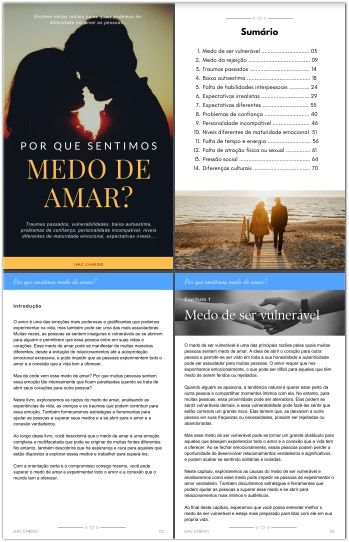 E-book Por que sentimos medo de amar? Com 76 páginas de conteúdo aprofundado, você descobrirá as causas comuns do medo de amar, incluindo traumas passados, baixa autoestima, falta de habilidades interpessoais e expectativas irrealistas. Você aprenderá estratégias práticas para enfrentar esses medos, incluindo como construir a autoconfiança, comunicar suas necessidades e limites, e estabelecer expectativas realistas para seus relacionamentos